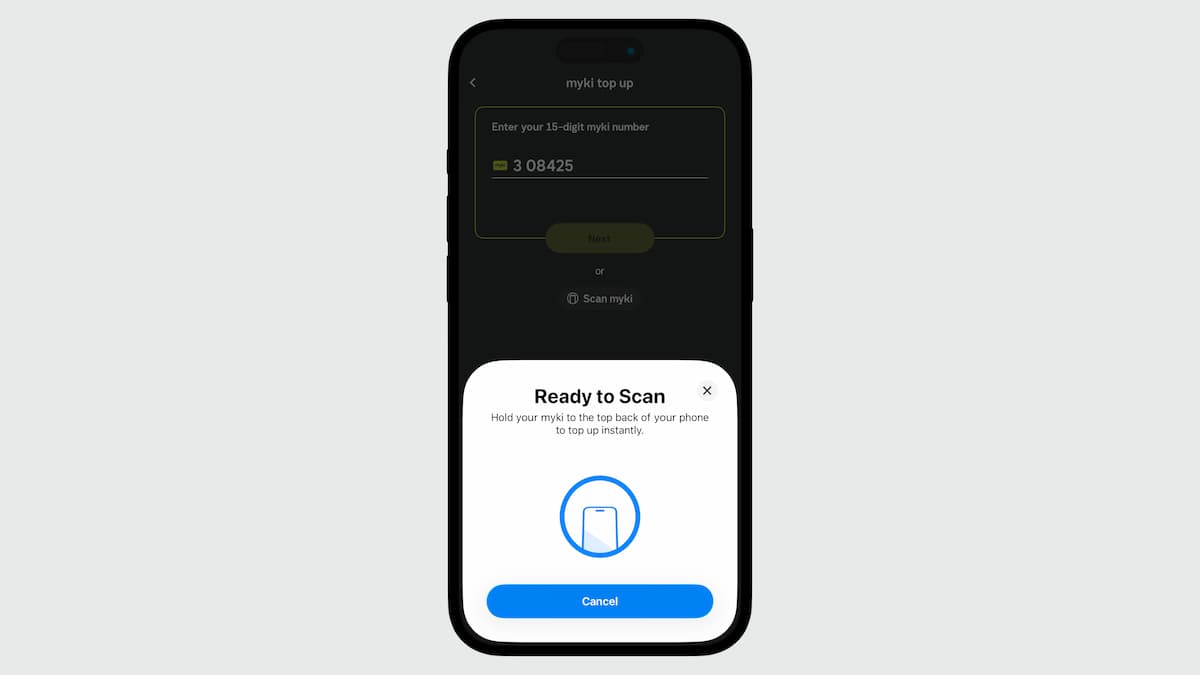 すると、NFCのカード読み取り(スキャン)画面がでるので、画面の指示に従って、iPhoneを myki の上におき、カード情報を読み取ります。