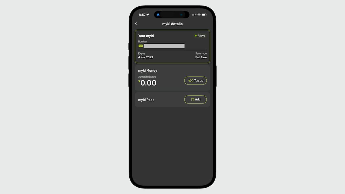 読み取りが正常に完了すると、その myki の情報がアプリ上に表示されるので、そこで「Top up」をタップします。