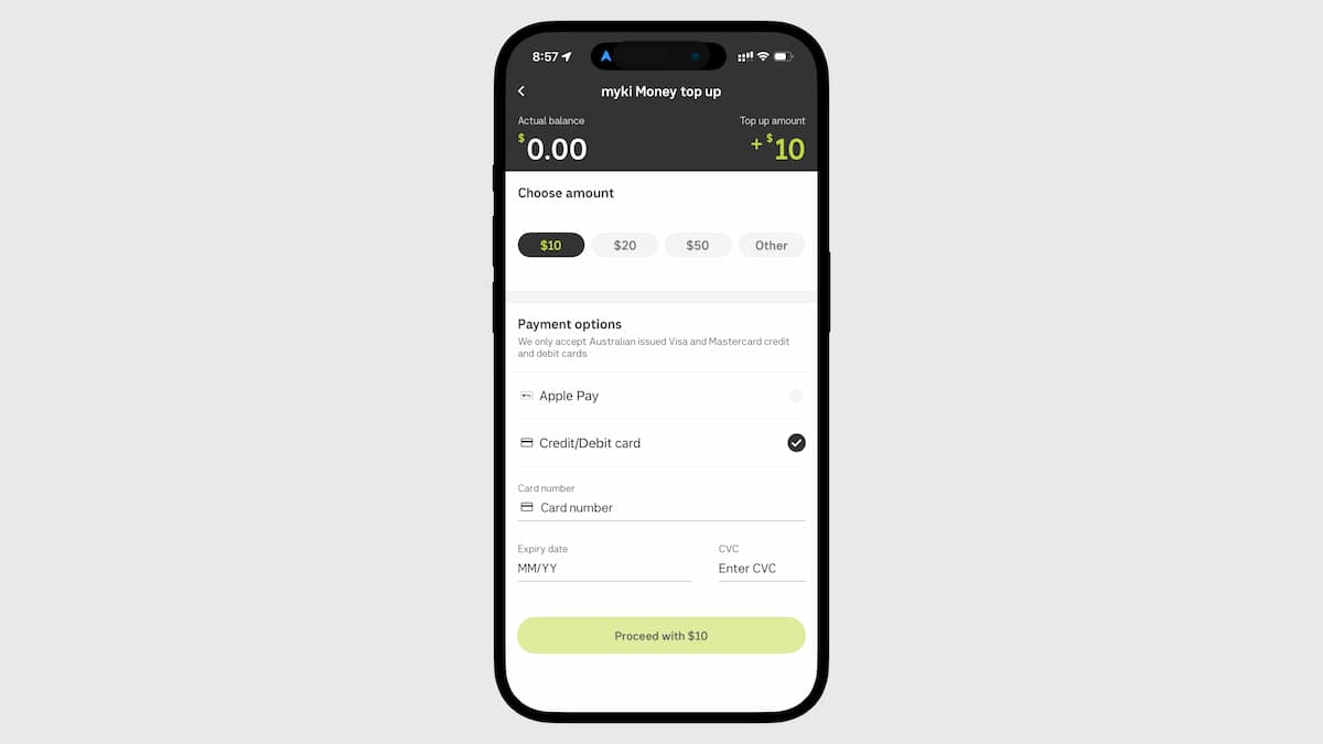 次に、チャージする金額と支払い方法を選択します。iPhoneの場合、選択できる支払い方法はApple Payまたはクレジット or デビットカード。チャージ金額はA$10がミニマムとなっていました。
